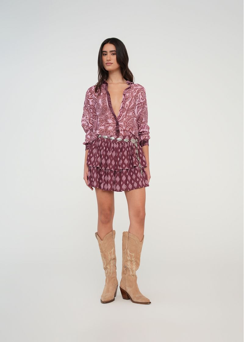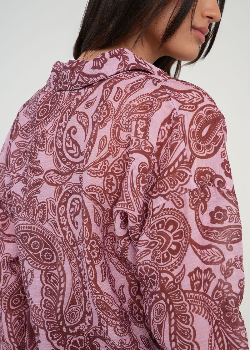 Camisa estampada manga larga • Cuello en V. • Manga larga. • Perilla de botones. • Ajuste en puños. • Bolero en ruedo. • Diseño estampado. • Tela fluida. • Se mueve contigo en cada paso, garantizando frescura y naturalidad. *Algunas pantallas pueden alterar el color real de la prenda. *La modelo usa una camisa talla S.