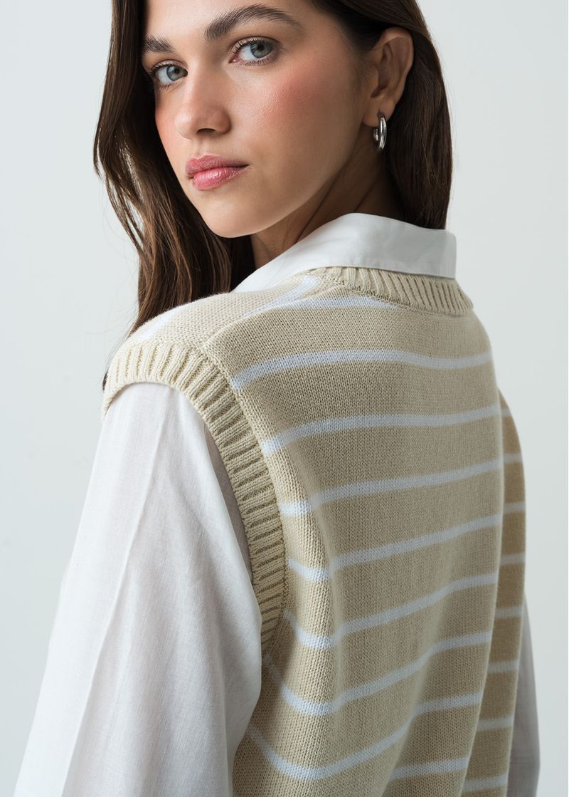 • Chaleco tejido super puesto a rayas.