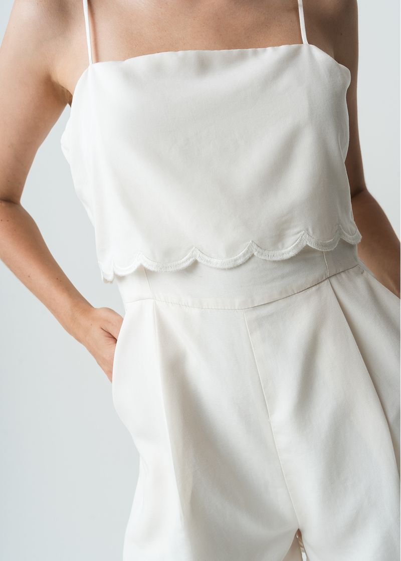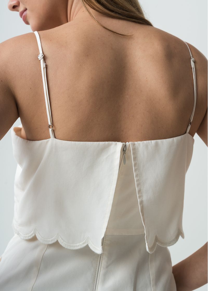 • Pieza en escote con terminaciones ondeadas.